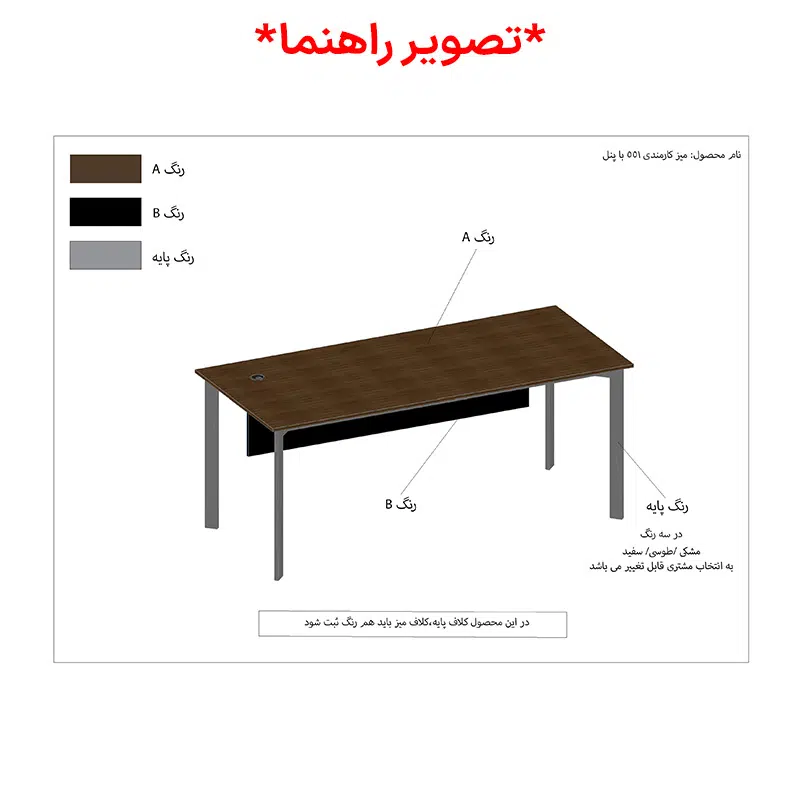 توجه : برای تکمیل گزینه های انتخاب رنگ به تصویر راهنما در گالری محصول دقت کنید.یک میز اداری میزی‌ست که استانداردهای لازم و تعیین شده را برای فردی که از آن میز استفاده می‌کند داشته باشد، یعنی ارتفاع میز مناسب فرد باشد، اندازه‌ی عرض و طول میز با کاری که کارمند انجام می‌دهد تناسب داشته باشد و مخصوص اتاق او تهیه شده باشد.میز های اداری برند نیلپر با توجه رعایت تمام اصول با توجه به نیازکاربر در تولید بسیار گزینه مناسبی برای خرید می باشد.